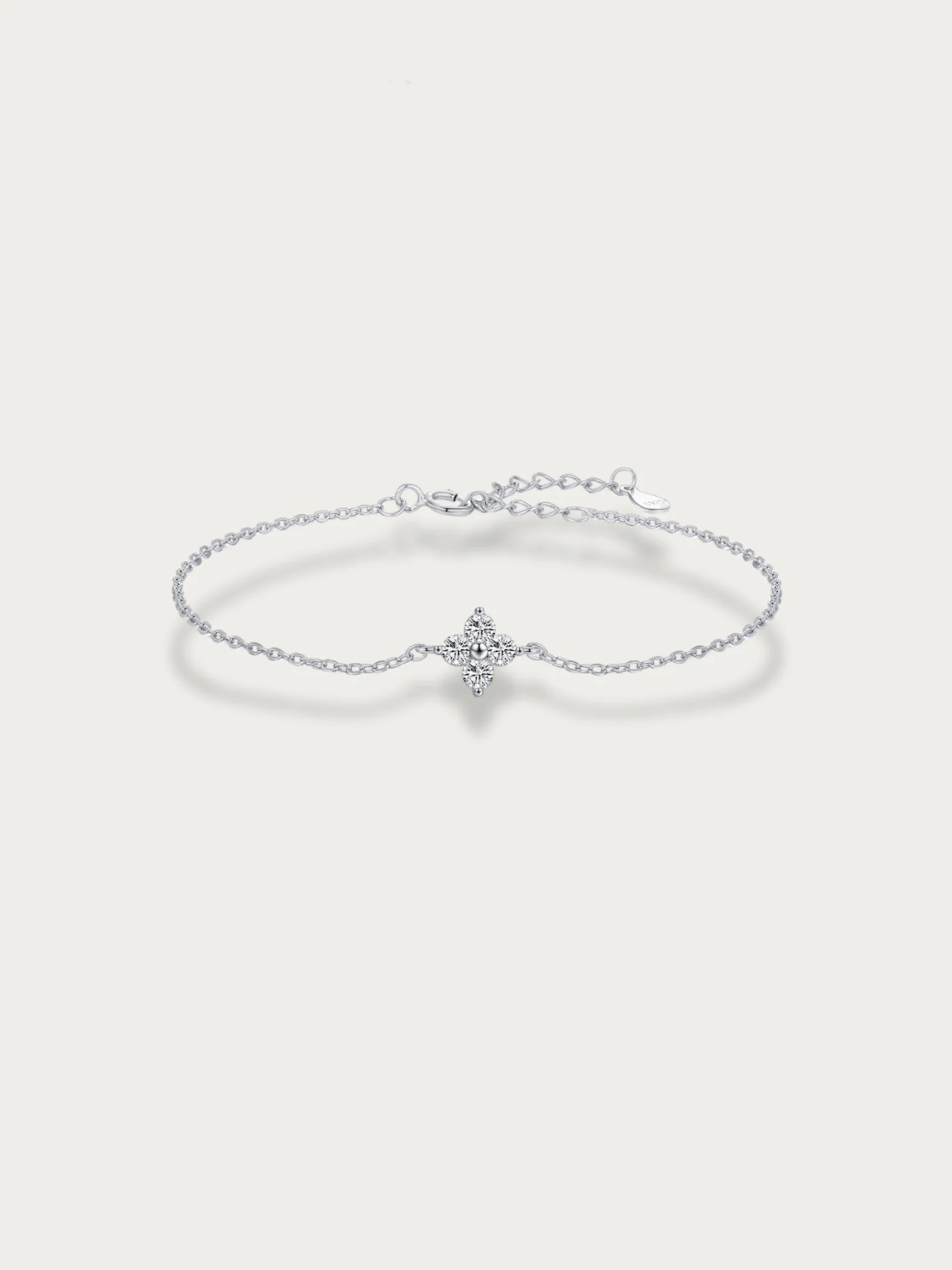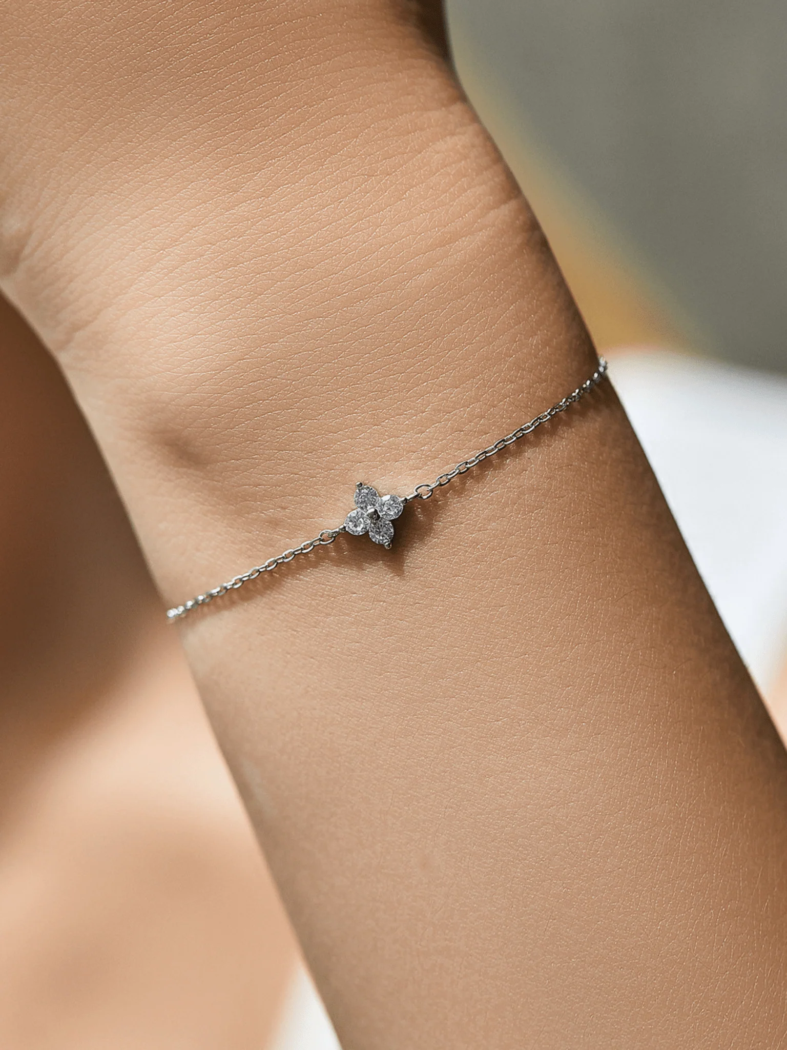 Where wishes meet the stars. The Asteria Petite Clover Glow Bracelet is a delicate tribute to the little miracles that brighten our daily lives. Featuring a dainty four-petal clover crafted from refined, sparkling stones, this piece serves as a wearable symbol of hope, luck, love, and joy.